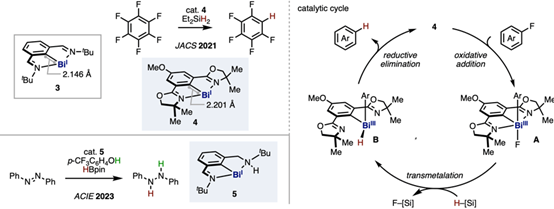 BiI物种易氧化且不稳定,难以用于催化反应。前人研究发现,一种基于N,C,N-钳形配体的铋宾(bismutinidene)络合物3以单体形式存在,据此推测,若采用类似结构的催化剂,有望建立BiI/BiIII的常规催化体系。在实际应用中,采用结构与3相似的Bi/Phebox催化剂4,通过二乙基硅烷成功实现全氟芳烃的氢化脱氟反应。其反应机理:4与全氟芳烃经氧化加成生成BiIII物种A,A与硅烷经转金属化生成BiIII络合物 B。最后,B经还原消除获得产物并再生催化剂4。进一步研究发现,3不能用于此反应。X射线晶体结构分析结果表明,4的C(sp2)-Bi键长比3长。此结果表明,铋中心的非键合电子对向邻近sp²碳原子的离域收到抑制,并改善了对BiI物种氧化加成的反应性。与此相关,已有文献报道,在BiI催化剂5存在下,可利用三氟甲基苯酚与频哪醇硼烷(HBpin)实现偶氮苯的还原反应。